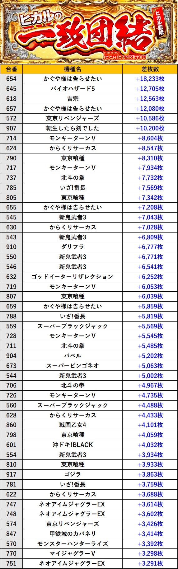 神奈川ARROW平塚店 過去の取材結果はこちら 取材日 2025年11月1日(土) 並びの人数 抽選308名 / 一般47名 内容 ヒカルの一致団結 『ヒカルの一致団結』差枚数TOP50 過去の取材結果はこちら
