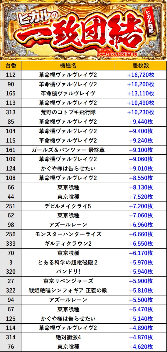 東京YASUDA7店 過去の取材結果はこちら 取材日 2025年11月11日(火) 並びの人数 抽選500名 / 一般19名 内容 🌓ヒカルの一致団結🌓 『ヒカルの一致団結』ランキングTOP30 ※弊社独自調べによるデータになります。 過去の取材結果はこちら