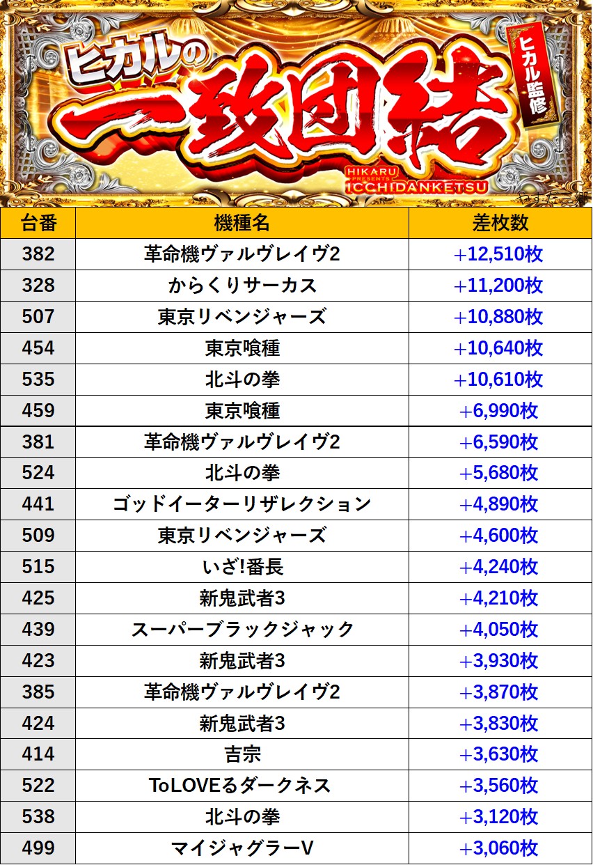 埼玉やすだ 三郷店 過去の取材結果はこちら 取材日 2025年11月11日(火) 並びの人数 抽選39名 / 一般33名 内容 🌓ヒカルの一致団結🌓 『ヒカルの一致団結』ランキング ※弊社独自調べによるデータになります。 過去の取材結果はこちら