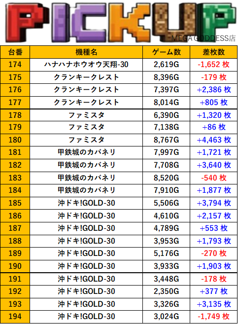 千葉MEGA GODDESS店 過去の取材結果はこちら 取材日 2025年11月21日(金) 並びの人数 抽選58名 / 一般33名 内容 スロミュー七福神 応援ホール Pickup箇所①【174~194】 Pickup箇所② Pickup箇所③ Pickup箇所④ 過去の取材結果はこちら