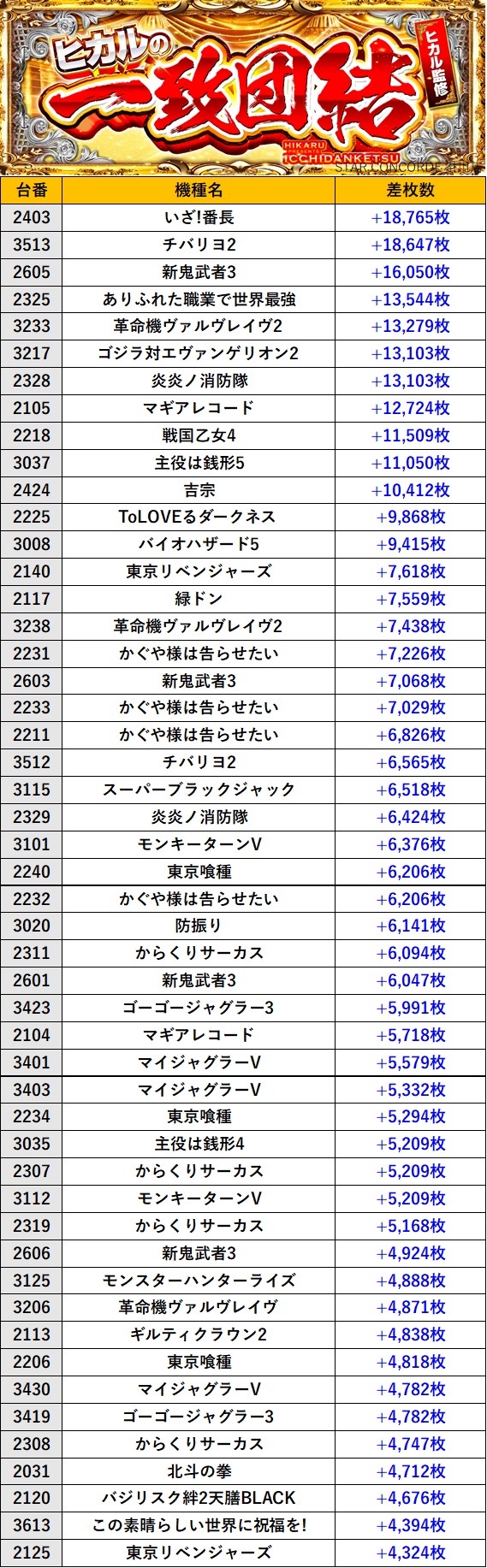 静岡STAR CONCORDE 掛川店 過去の取材結果はこちら 取材日 2025年11月22日(土) 並びの人数 抽選540名 / 一般20名 内容 🌓ヒカルの一致団結🌓 『ヒカルの一致団結』ランキング 過去の取材結果はこちら