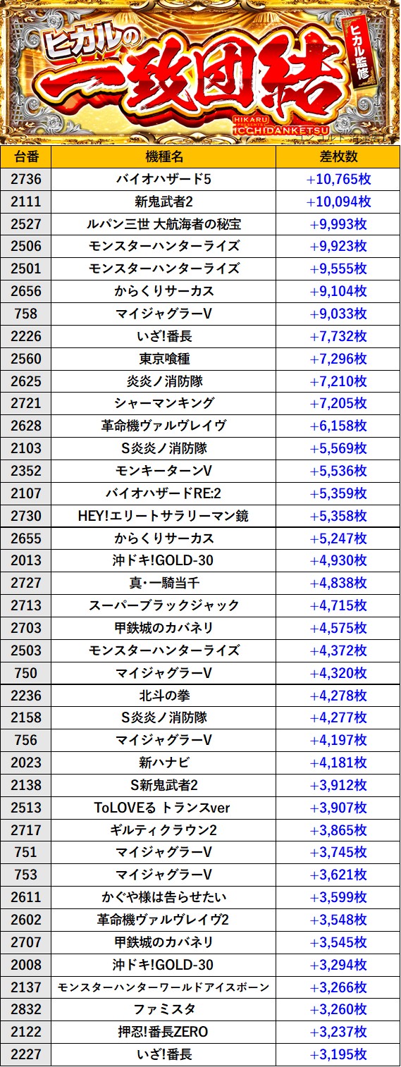 静岡コンコルド 沼津店1・2 過去の取材結果はこちら 取材日 2025年11月22日(土) 並びの人数 抽選298名 / 一般40名 内容 🌓ヒカルの一致団結🌓 『ヒカルの一致団結』ランキング 過去の取材結果はこちら