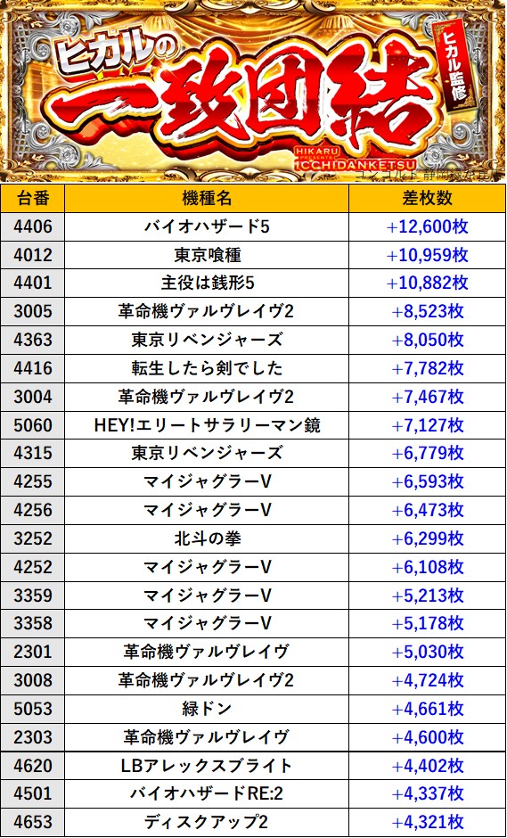 静岡コンコルド 静岡緑が丘店 過去の取材結果はこちら 取材日 2025年11月22日(土) 並びの人数 抽選290名 / 一般306名 内容 🌓ヒカルの一致団結🌓 『ヒカルの一致団結』ランキング 過去の取材結果はこちら