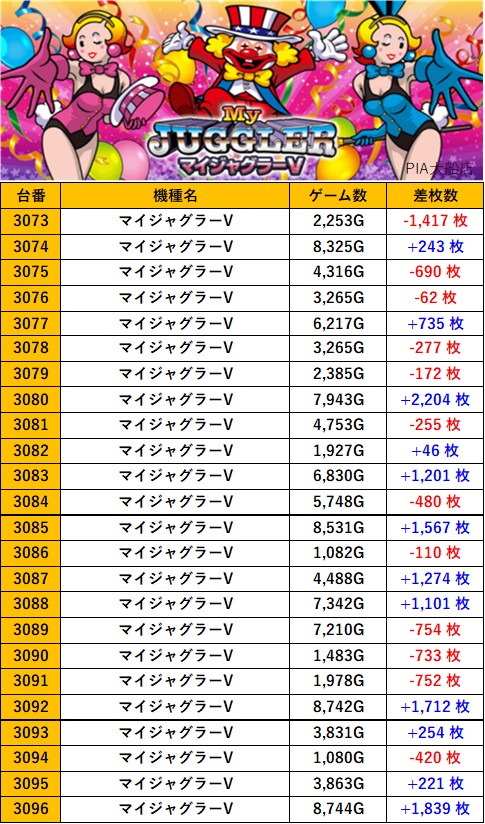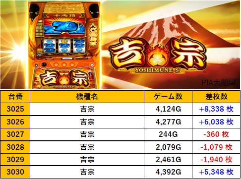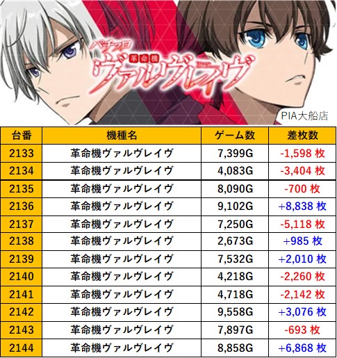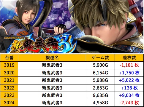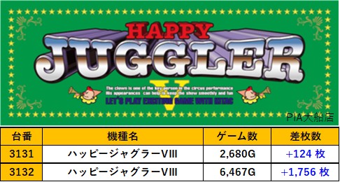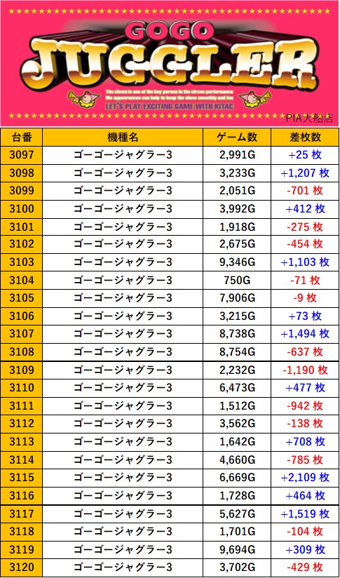 神奈川PIA大船店 過去の取材結果はこちら 取材日 2025年11月3日(月) 並びの人数 抽選56名 / 一般25名 内容 スロミュー七福神 応援ホール マギアレコード 新鬼武者3 東京喰種 吉宗 かぐや様は告らせたい 北斗の拳 マイジャグラーV ゴーゴージャグラー3 革命機ヴァルヴレイヴ モンキーターンV ハッピージャグラーVⅢ その他Pickup箇所 過去の取材結果はこちら