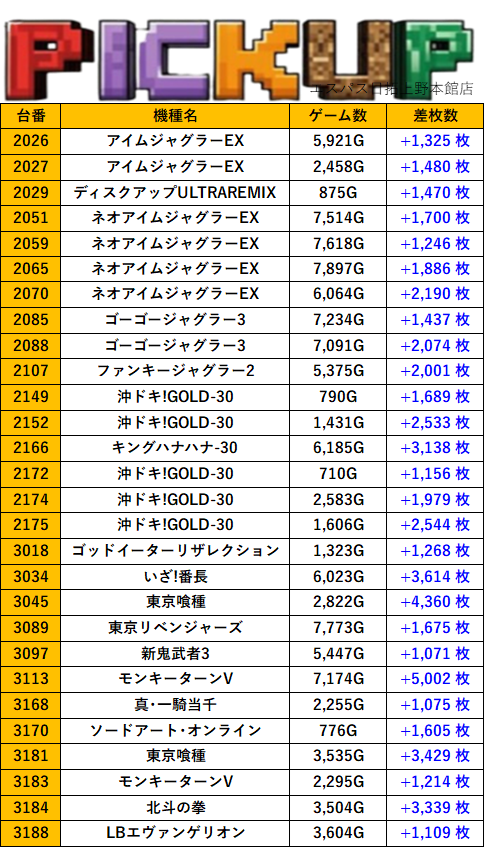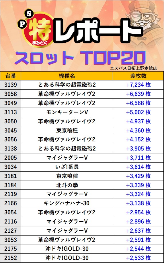 東京エスパス日拓上野本館店 過去の取材結果はこちら 取材日 2025年11月4日(火) 並びの人数 抽選270名 / 一般20名 内容 応援ホール マル特レポート スロミューマル特レポートTOP20 革命機ヴァルヴレイヴ2 とある科学の超電磁砲2 Pickup箇所 その他Pickup箇所 過去の取材結果はこちら