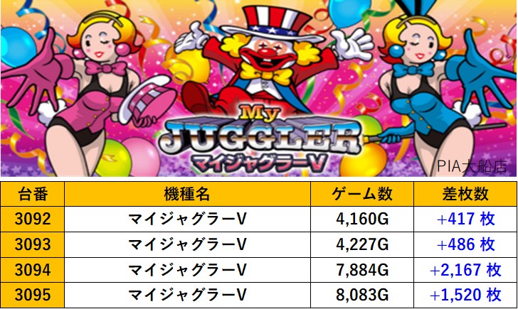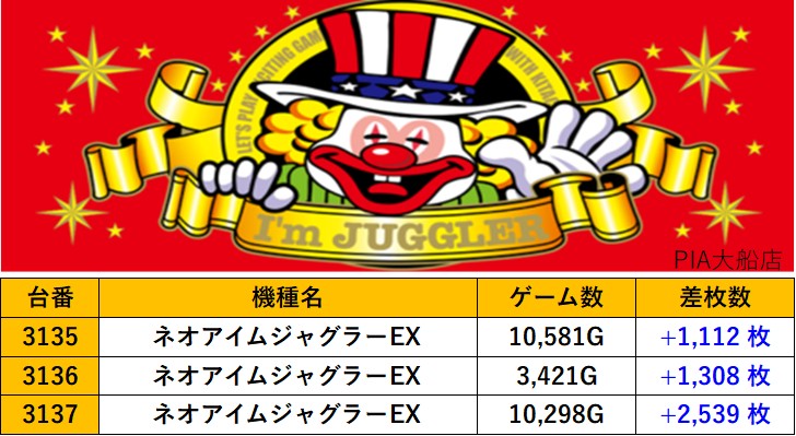神奈川PIA大船店 過去の取材結果はこちら 取材日 2025年11月8日(土) 並びの人数 抽選99名 / 一般19名 内容 スロミュー七福神 応援ホール レヴュースタァライト モンキーターンV マギアレコード かぐや様は告らせたい ジャグラーガールズ 東京リベンジャーズ 東京喰種 革命機ヴァルヴレイヴ2 ミスタージャグラー Pickup箇所① Pickup箇所② Pickup箇所③ Pickup箇所④ その他Pickup箇所 過去の取材結果はこちら