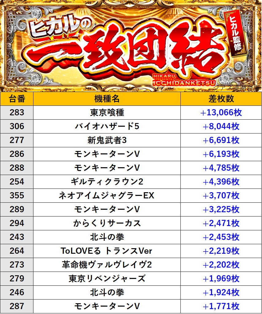 神奈川ジアス港南台店 過去の取材結果はこちら 取材日 2025年12月1日(月) 並びの人数 抽選51名 / 一般6名 内容 🌓ヒカルの一致団結🌓 『ヒカルの一致団結』ランキング 過去の取材結果はこちら