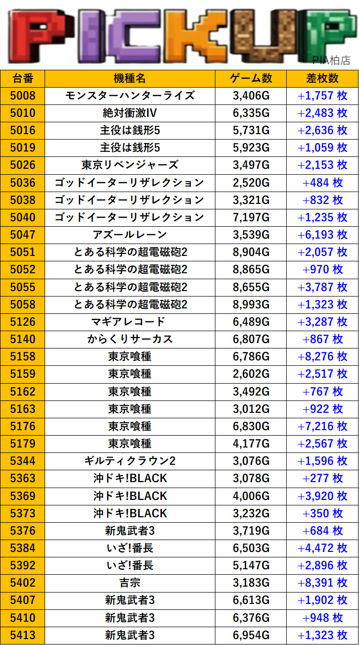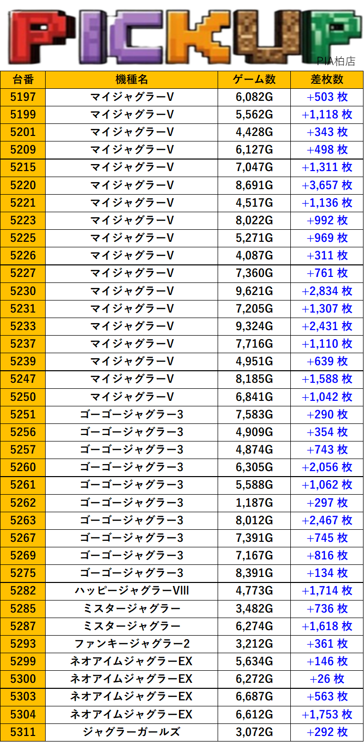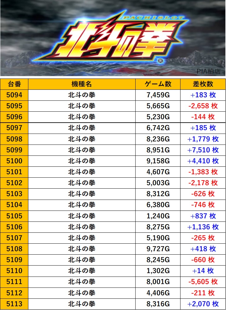 千葉PIA柏店 過去の取材結果はこちら 取材日 2025年11月7日(金) 並びの人数 抽選46名 / 一般85名 内容 スロミュー七福神 応援ホール ダリフラ LBアレックスブライト 北斗の拳 革命機ヴァルヴレイヴ2 モンキーターンV Pickup箇所 その他Pickup箇所① その他Pickup箇所② 過去の取材結果はこちら