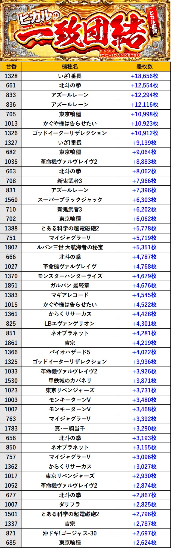 新潟ミッド・ガーデン堀之内店 過去の取材結果はこちら 取材日 2025年11月22日(土) 並びの人数 抽選217名 / 一般45名 内容 🌓ヒカルの一致団結🌓 『ヒカルの一致団結』ランキング 過去の取材結果はこちら