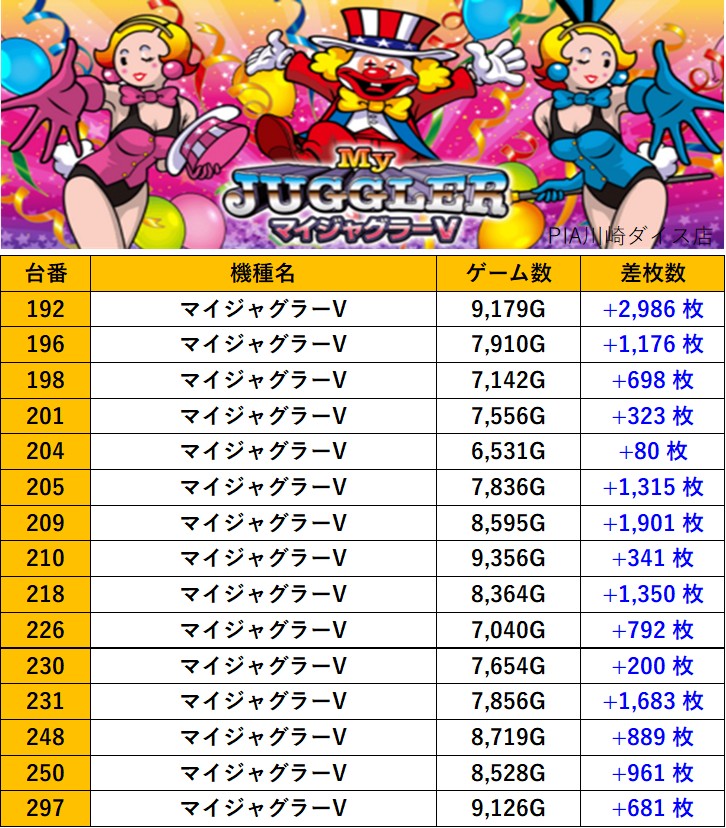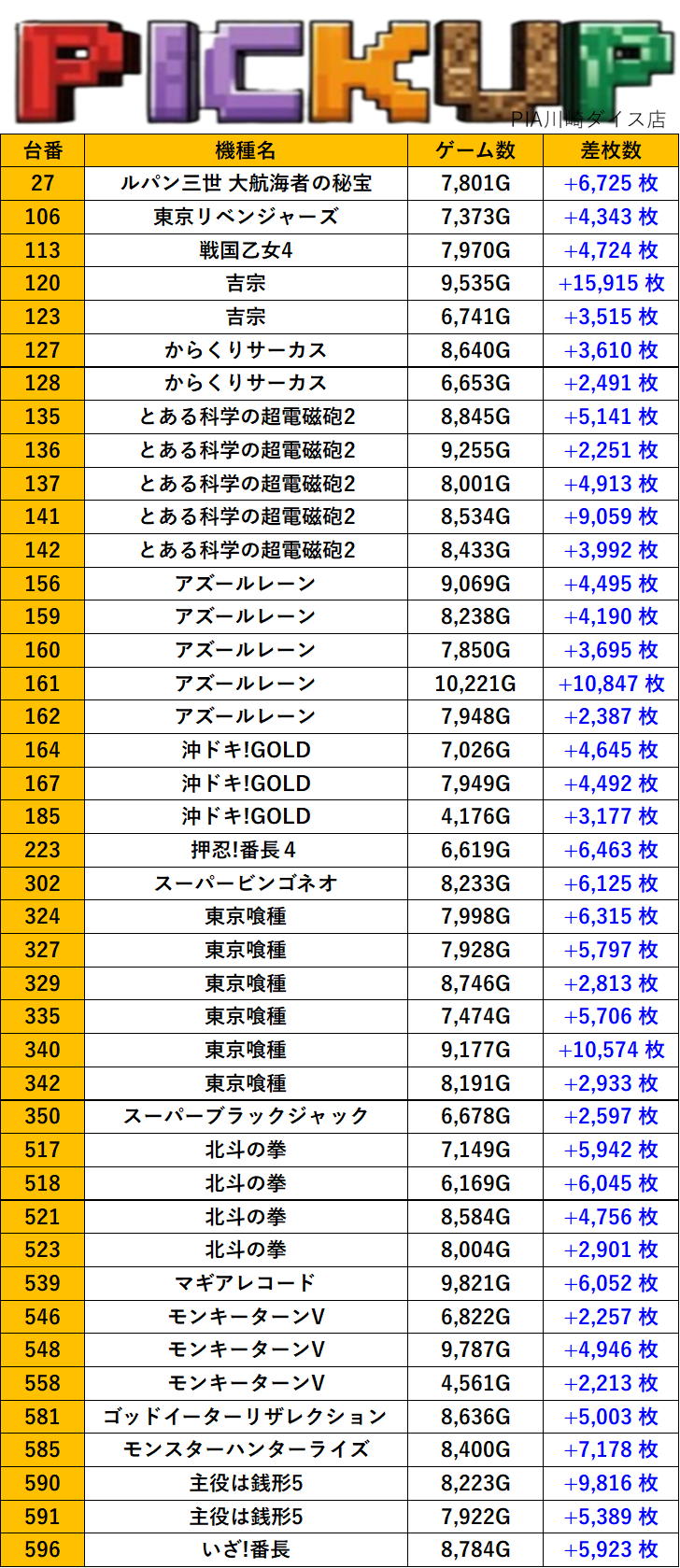 神奈川PIA川崎ダイス店 過去の取材結果はこちら 取材日 2025年11月29日(土) 並びの人数 抽選185名 / 一般278名 内容 スロミュー七福神 応援ホール Pickup箇所① Pickup箇所② Pickup箇所③ Pickup箇所④ その他Pickup箇所 過去の取材結果はこちら