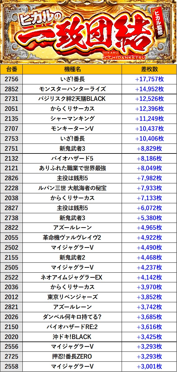 静岡コンコルド 御前崎店 過去の取材結果はこちら 取材日 2025年12月7日(日) 並びの人数 抽選89名 / 一般69名 内容 🌓ヒカルの一致団結🌓 『ヒカルの一致団結』ランキング 過去の取材結果はこちら