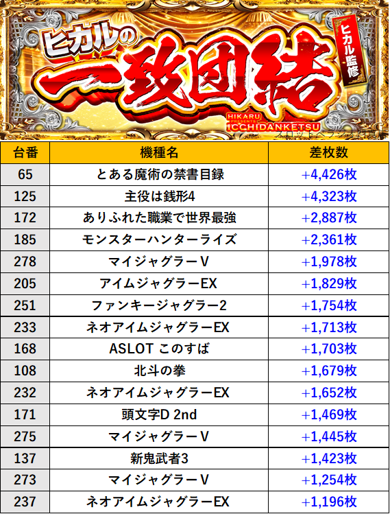 大阪スロットべラジオ門真店 過去の取材結果はこちら 取材日 2025年12月20日(土) 並びの人数 抽選7名 / 一般5名 内容 🌓ヒカルの一致団結🌓 『ヒカルの一致団結』ランキング 過去の取材結果はこちら