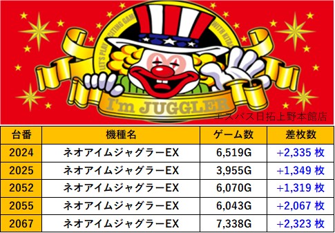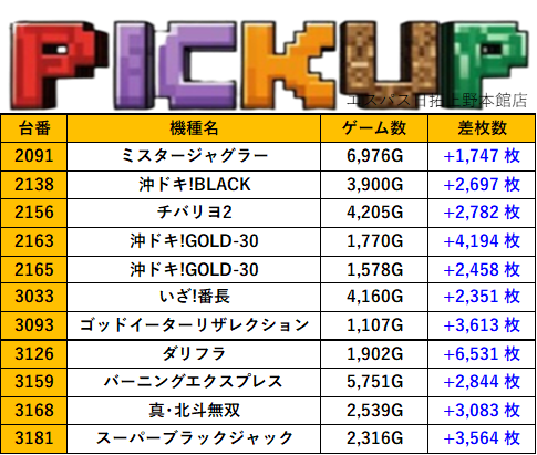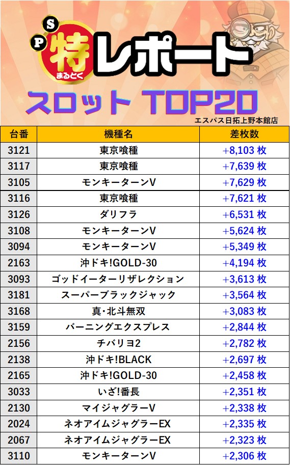 東京エスパス日拓上野本館店 過去の取材結果はこちら 取材日 2025年12月4日(木) 並びの人数 抽選206名 / 一般14名 内容 応援ホール マル特レポート スロミューマル特レポートTOP20 Pickup箇所① Pickup箇所② Pickup箇所③ Pickup箇所④ その他Pickup箇所 過去の取材結果はこちら
