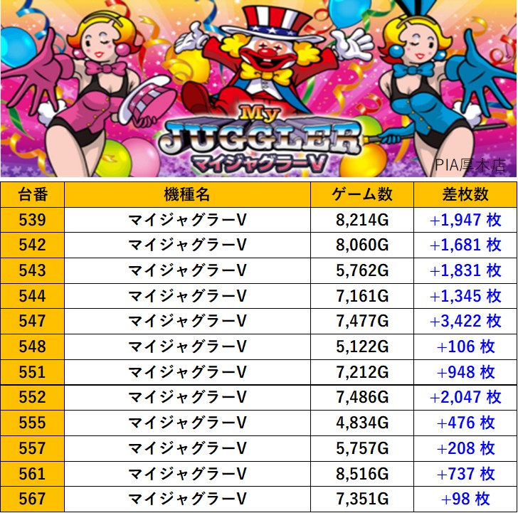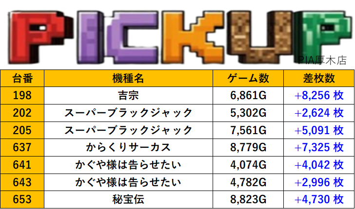 神奈川PIA厚木店 過去の取材結果はこちら 取材日 2025年12月27日(土) 並びの人数 抽選23名 / 一般76名 内容 スロミュー七福神 応援ホール Pickup箇所① Pickup箇所② Pickup箇所③ Pickup箇所④ Pickup箇所⑤ Pickup箇所⑥ その他Pickup箇所 過去の取材結果はこちら