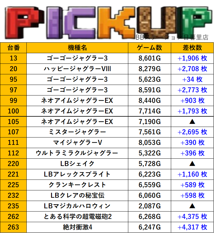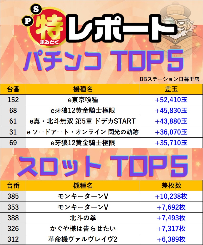 東京BBステーション日暮里店 過去の取材結果はこちら 取材日 2025年12月6日(土) 並びの人数 抽選44名 / 一般22名 内容 応援ホール マル特レポート スロミューマル特レポートTOP5 Pickup箇所① Pickup箇所② Pickup箇所③ その他Pickup箇所 過去の取材結果はこちら