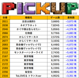 千葉PIA津田沼店 過去の取材結果はこちら 取材日 2025年12月25日(木) 並びの人数 抽選60名 / 一般100名 内容 スロミュー七福神 応援ホール Pickup箇所① Pickup箇所② Pickup箇所③ Pickup箇所④ Pickup箇所⑤ Pickup箇所⑥ その他Pickup箇所 過去の取材結果はこちら