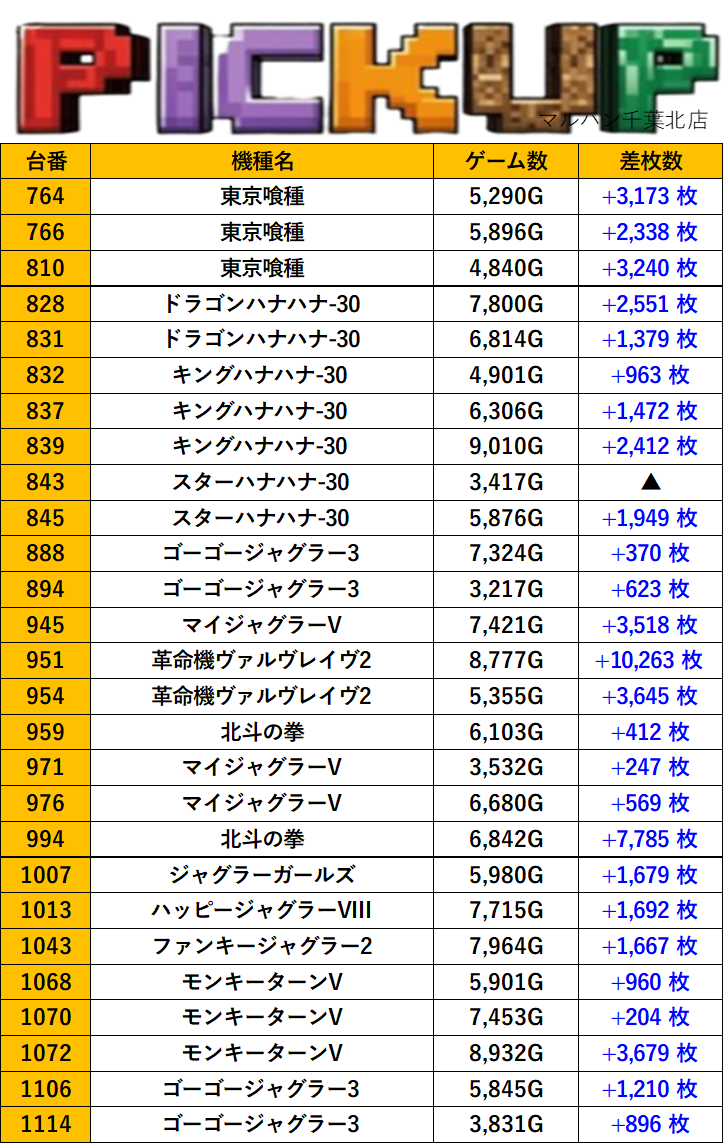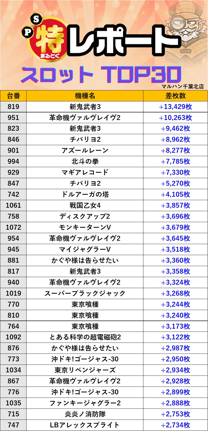 千葉マルハン千葉北店 過去の取材結果はこちら 取材日 2025年12月5日(金) 並びの人数 抽選56名 / 一般22名 内容 マル特レポート 応援ホール スロミューマル特レポートTOP30 Pickup箇所① Pickup箇所② その他Pickup箇所 過去の取材結果はこちら