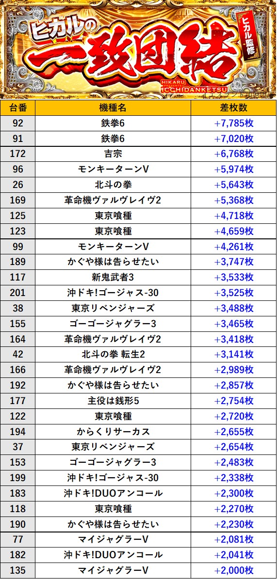 鹿児島イエスランド加世田店 過去の取材結果はこちら 取材日 2026年1月8日(木) 並びの人数 抽選75名 / 一般80名 内容 🌓ヒカルの一致団結🌓 『ヒカルの一致団結』ランキング 過去の取材結果はこちら