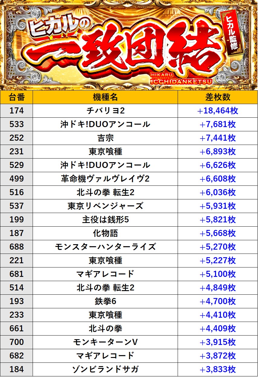 長野ニューアサヒ上田店 過去の取材結果はこちら 取材日 2026年1月11日(日) 並びの人数 抽選104名 / 一般40名 内容 🌓ヒカルの一致団結🌓 『ヒカルの一致団結』ランキング 過去の取材結果はこちら
