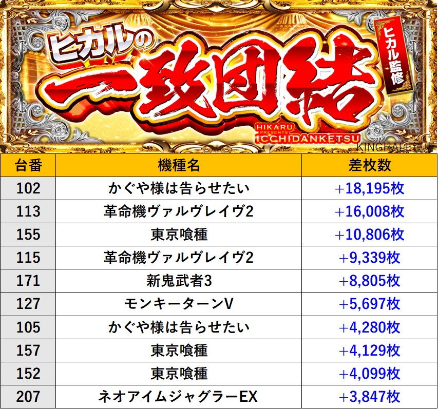 佐賀KINGHALL鏡店 過去の取材結果はこちら 取材日 2026年3月3日(火) 並びの人数 抽選52名 / 一般12名 内容 🌓ヒカルの一致団結🌓 『ヒカルの一致団結』ランキング 過去の取材結果はこちら