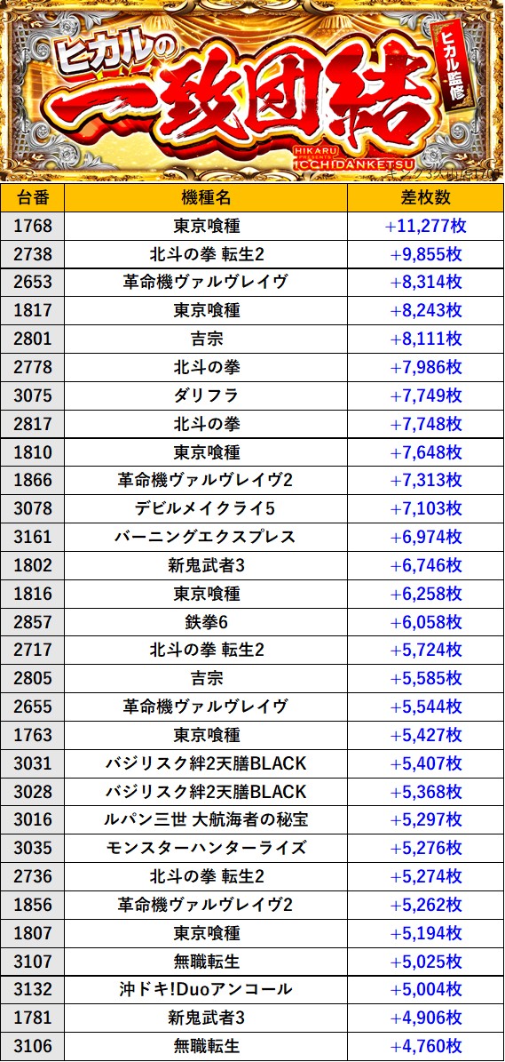 福岡キング3久山店1700 過去の取材結果はこちら 取材日 2026年1月10日(土) 並びの人数 抽選274名 / 一般155名 内容 🌓ヒカルの一致団結🌓 『ヒカルの一致団結』ランキング 過去の取材結果はこちら