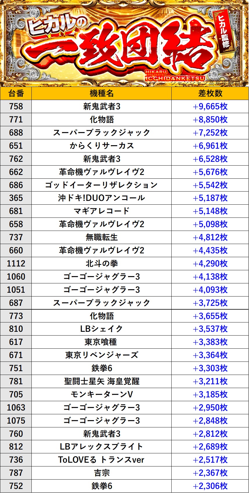 東京ジャンジャン高島平駅前店 過去の取材結果はこちら 取材日 2026年1月25日(日) 並びの人数 抽選60名 / 一般33名 内容 🌓ヒカルの一致団結🌓 『ヒカルの一致団結』ランキング 過去の取材結果はこちら