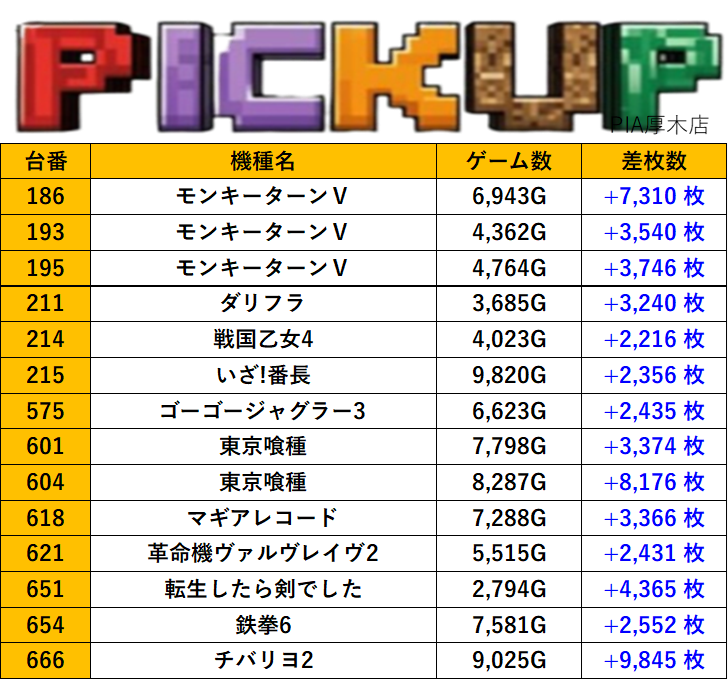 神奈川PIA厚木店 過去の取材結果はこちら 取材日 2026年1月7日(水) 並びの人数 抽選13名 / 一般26名 内容 スロミュー七福神 Pickup箇所① Pickup箇所② Pickup箇所③ Pickup箇所④ その他Pickup箇所 過去の取材結果はこちら