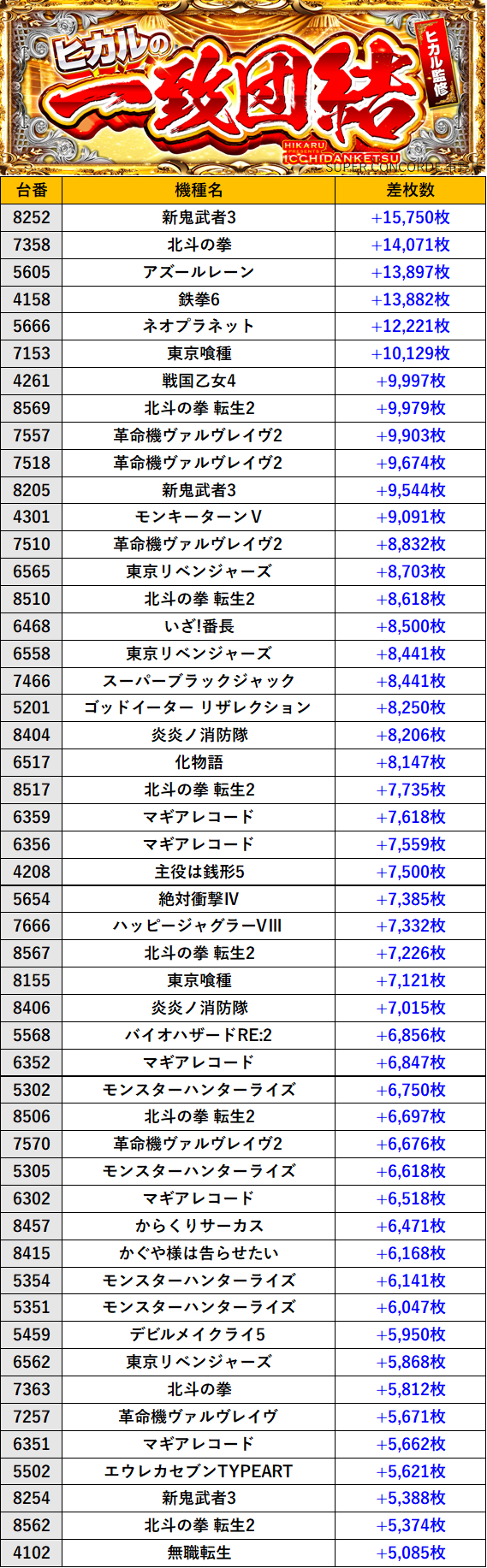 静岡SUPER CONCORDE 市野店 過去の取材結果はこちら 取材日 2026年1月17日(土) 並びの人数 抽選1200名 / 一般200名 内容 🌓ヒカルの一致団結🌓 『ヒカルの一致団結』ランキング 過去の取材結果はこちら