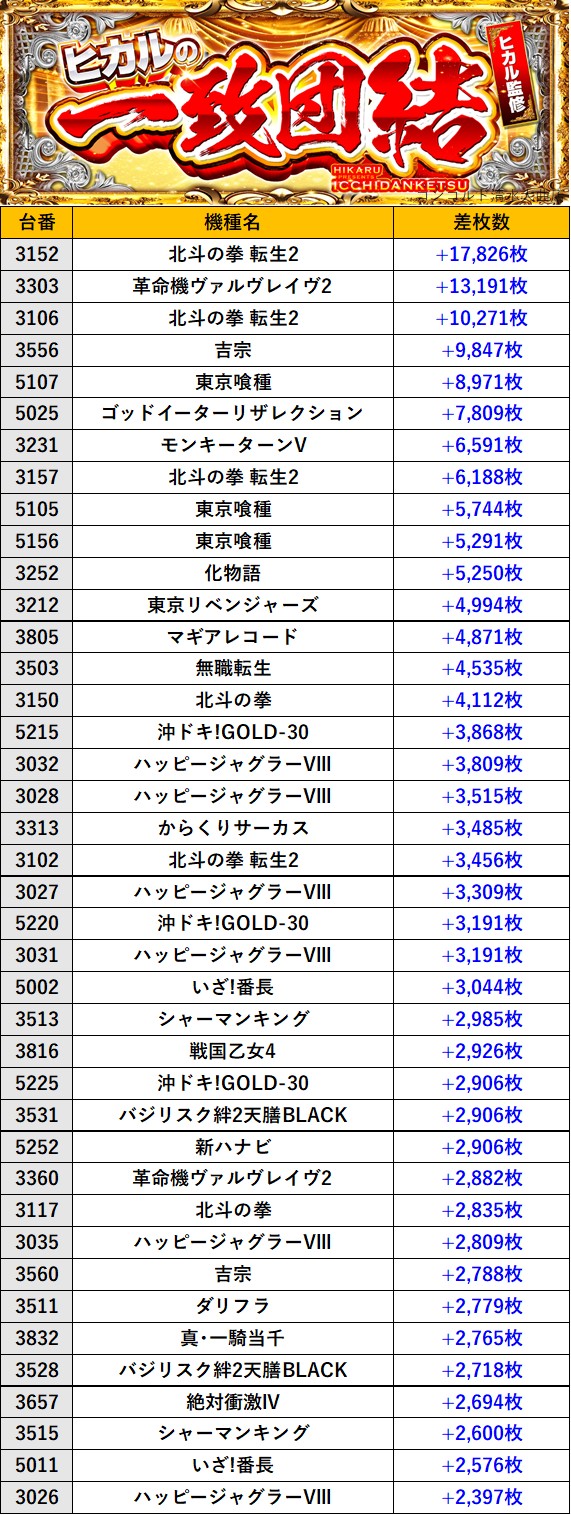 静岡コンコルド 清水大曲店 過去の取材結果はこちら 取材日 2026年1月17日(土) 並びの人数 抽選120名 / 一般200名 内容 🌓ヒカルの一致団結🌓 『ヒカルの一致団結』ランキング 過去の取材結果はこちら