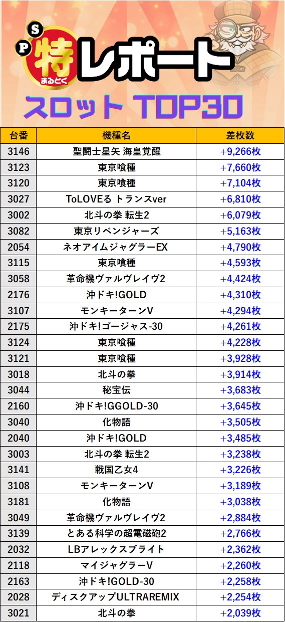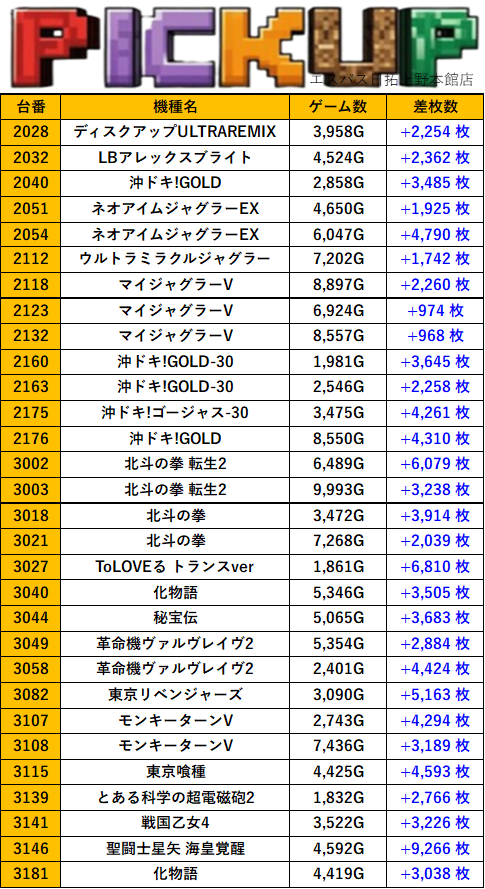 東京エスパス日拓上野本館店 過去の取材結果はこちら 取材日 2026年1月27日(火) 並びの人数 抽選150名 / 一般38名 内容 マル特レポート スロミューマル特レポートTOP30 Pickup箇所① Pickup箇所② Pickup箇所③ その他Pickup箇所 過去の取材結果はこちら