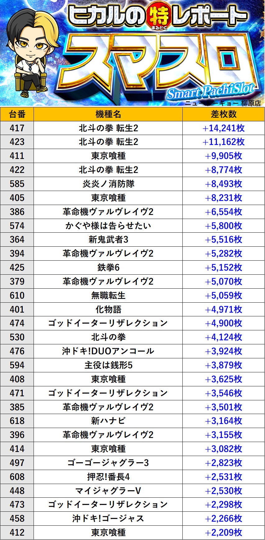 長野ニュートーキョー 柳原店 過去の取材結果はこちら 取材日 2026年1月17日(土) 並びの人数 抽選54名 / 一般47名 内容 ヒカルのまるとくレポート(スマスロ取材) ヒカルのまるとくレポートランキング Pickup箇所① Pickup箇所② Pickup箇所③ その他Pickup箇所 過去の取材結果はこちら
