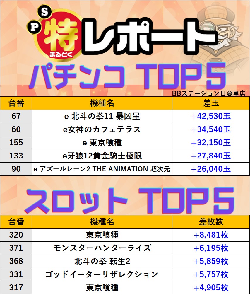 東京BBステーション日暮里店 過去の取材結果はこちら 取材日 2026年1月24日(土) 並びの人数 抽選38名 / 一般15名 内容 マル特レポート スロミューマル特レポートTOP5 Pickup箇所① Pickup箇所② Pickup箇所③ Pickup箇所④ Pickup箇所⑤ Pickup箇所⑥ Pickup箇所⑦ Pickup箇所⑧ Pickup箇所⑨ Pickup箇所⑩ 過去の取材結果はこちら