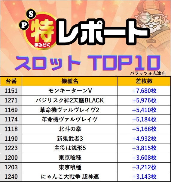 千葉パラッツォ志津店 過去の取材結果はこちら 取材日 2026年1月4日(日) 並びの人数 抽選35名 / 一般17名 内容 マル特レポート スロミューマル特レポートTOP10 Pickup箇所① Pickup箇所② Pickup箇所③ Pickup箇所④ Pickup箇所⑤ 過去の取材結果はこちら