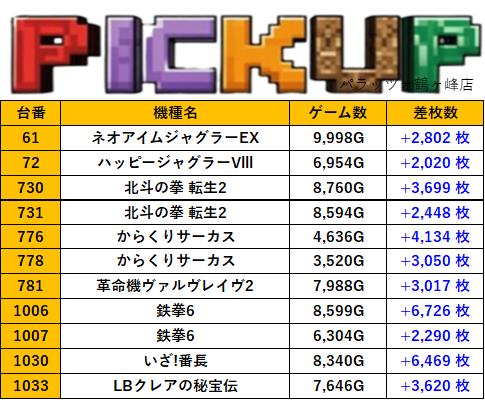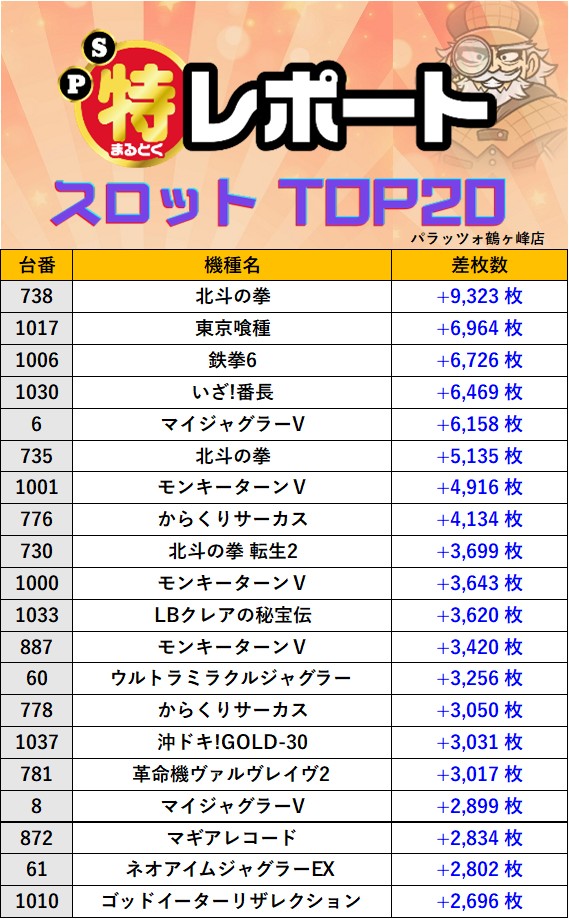 神奈川パラッツォ鶴ヶ峰店 過去の取材結果はこちら 取材日 2026年1月18日(日) 並びの人数 抽選39名 / 一般50名 内容 マル特レポート スロミューマル特レポートTOP20 Pickup箇所① Pickup箇所② Pickup箇所③ Pickup箇所④ Pickup箇所⑤ Pickup箇所⑥ その他Pickup箇所 過去の取材結果はこちら