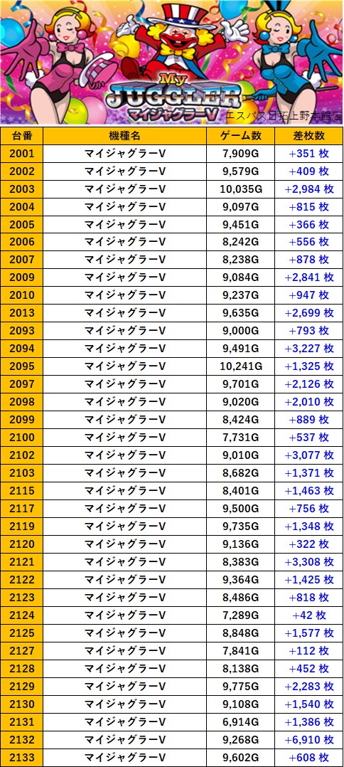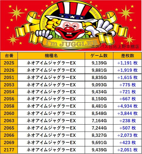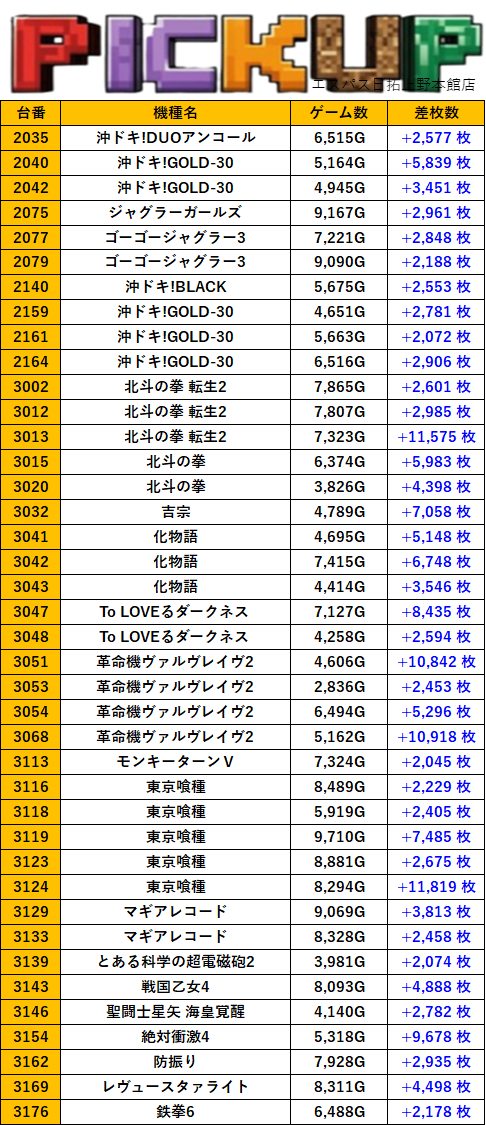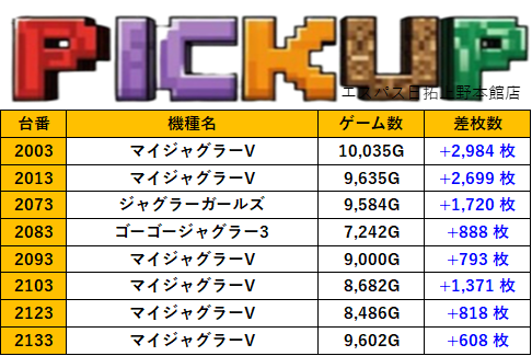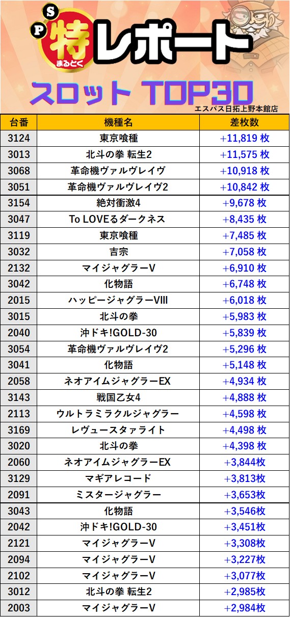 東京エスパス日拓上野本館店 過去の取材結果はこちら 取材日 2026年1月25日(日) 並びの人数 抽選423名 / 一般54名 内容 マル特レポート スロミューマル特レポートTOP30 Pickup箇所① Pickup箇所② Pickup箇所③ Pickup箇所④ Pickup箇所⑤ その他Pickup箇所① その他Pickup箇所② 過去の取材結果はこちら