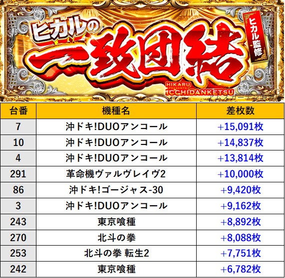 沖縄アムズガーデン泡瀬店 過去の取材結果はこちら 取材日 2026年1月10日(土) 並びの人数 抽選63名 / 一般94名 内容 🌓ヒカルの一致団結🌓 『ヒカルの一致団結』ランキング 過去の取材結果はこちら