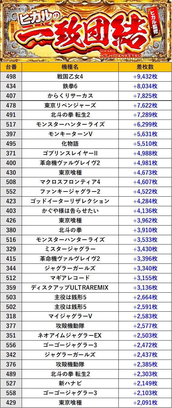 大阪SUPER COSMO PREMIUM 泉南店 過去の取材結果はこちら 取材日 2026年3月1日(日) 並びの人数 抽選145名 / 一般37名 内容 🌓ヒカルの一致団結🌓 『ヒカルの一致団結』ランキング 過去の取材結果はこちら