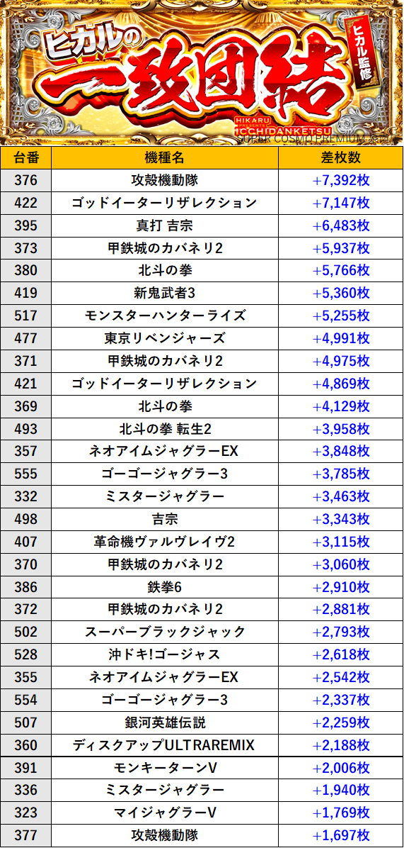 大阪SUPER COSMO PREMIUM 泉南店 過去の取材結果はこちら 取材日 2026年4月11日(土) 並びの人数 抽選110名 / 一般13名 内容 🌓ヒカルの一致団結🌓 『ヒカルの一致団結』ランキング 過去の取材結果はこちら