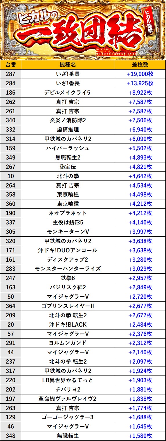 奈良Premium Five店 過去の取材結果はこちら 取材日 2026年4月11日(土) 並びの人数 抽選78名 / 一般26名 内容 🌓ヒカルの一致団結🌓 『ヒカルの一致団結』ランキング 過去の取材結果はこちら