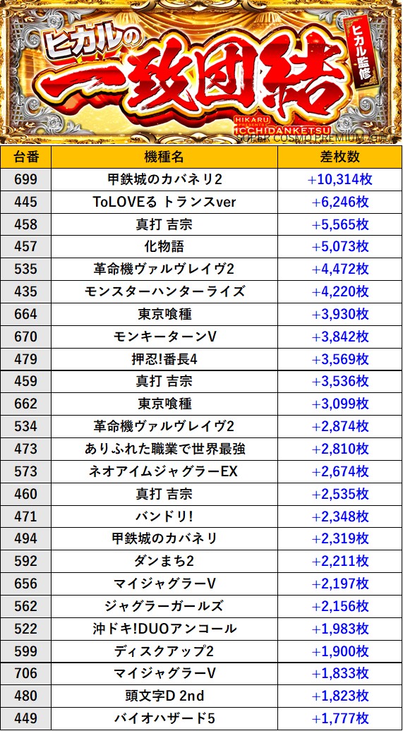 大阪SUPER COSMO PREMIUM 柏原店 過去の取材結果はこちら 取材日 2026年4月11日(土) 並びの人数 抽選12名 内容 🌓ヒカルの一致団結🌓 『ヒカルの一致団結』ランキング 過去の取材結果はこちら