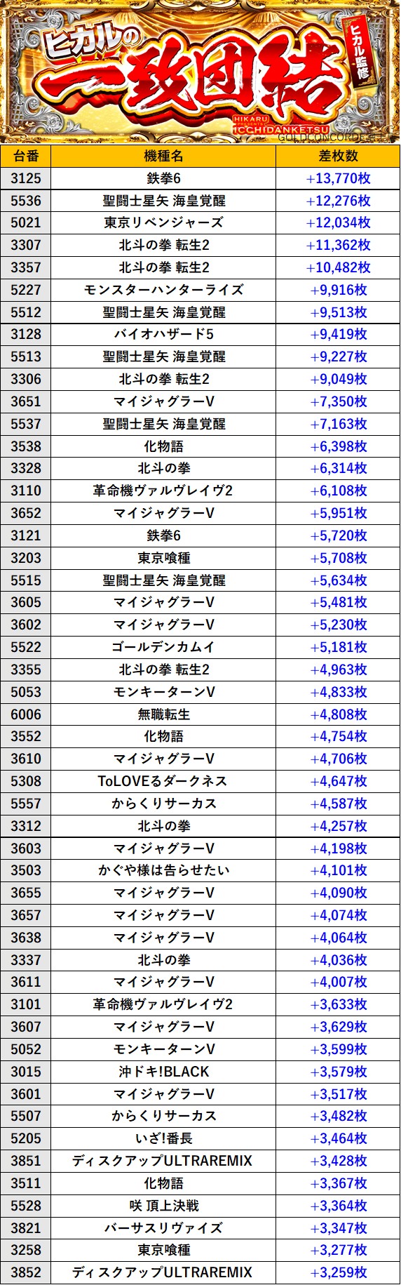 静岡GOLDCONCORDE富士店 過去の取材結果はこちら 取材日 2026年2月7日(土) 並びの人数 抽選248名 / 一般18名 内容 🌓ヒカルの一致団結🌓 『ヒカルの一致団結』ランキング 過去の取材結果はこちら