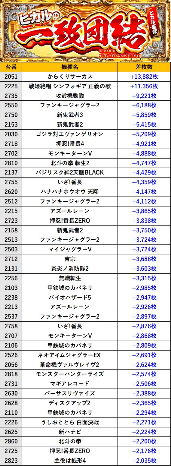 静岡コンコルド 御前崎店 過去の取材結果はこちら 取材日 2026年2月7日(土) 並びの人数 抽選100名 / 一般164名 内容 🌓ヒカルの一致団結🌓 『ヒカルの一致団結』ランキング 過去の取材結果はこちら