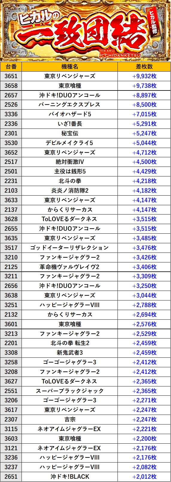 静岡コンコルド 浜松雄踏店 過去の取材結果はこちら 取材日 2026年2月7日(土) 並びの人数 抽選63名 / 一般192名 内容 🌓ヒカルの一致団結🌓 『ヒカルの一致団結』ランキング 過去の取材結果はこちら