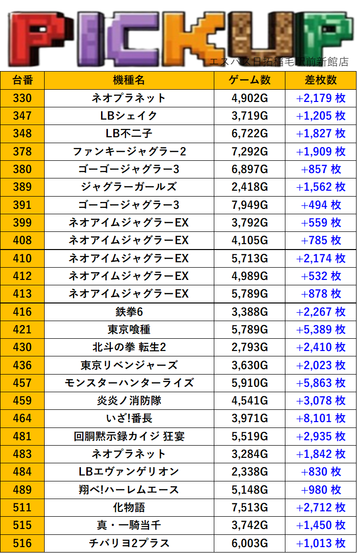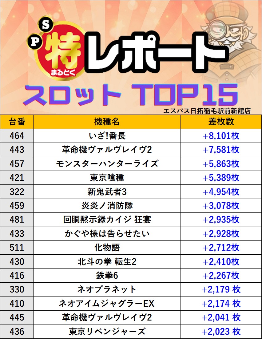 千葉エスパス日拓稲毛駅前新館店 過去の取材結果はこちら 取材日 2026年2月2日(月) 並びの人数 抽選31名 / 一般16名 内容 マル特レポート スロミューマル特レポートTOP15 Pickup箇所① Pickup箇所② Pickup箇所③ Pickup箇所④ Pickup箇所⑤ その他Pickup箇所 過去の取材結果はこちら