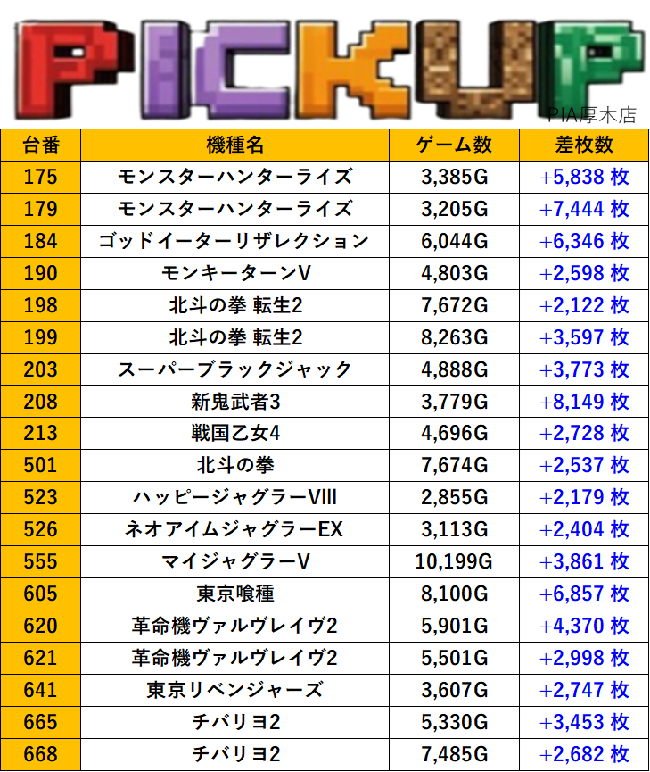 神奈川PIA厚木店 過去の取材結果はこちら 取材日 2026年2月17日(火) 並びの人数 抽選9名 / 一般6名 内容 スロミュー七福神 Pickup箇所① Pickup箇所② Pickup箇所③ Pickup箇所④ その他Pickup箇所 過去の取材結果はこちら