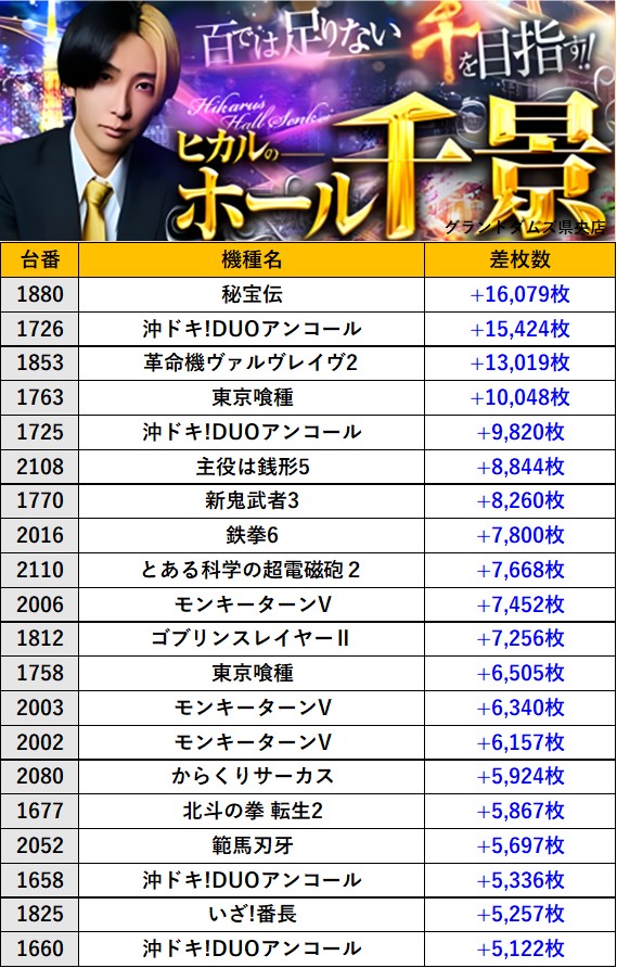 新潟グランドダムズ県央店 過去の取材結果はこちら 取材日 2026年2月14日(土) 並びの人数 抽選416名 / 一般125名 内容 ヒカルのホール千景 『ヒカルのホール千景』ランキング 過去の取材結果はこちら
