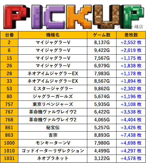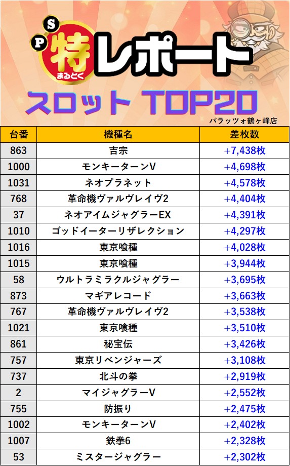神奈川パラッツォ鶴ヶ峰店 過去の取材結果はこちら 取材日 2026年2月28日(土) 並びの人数 抽選42名 / 一般30名 内容 マル特レポート スロミューマル特レポートTOP20 Pickup箇所① Pickup箇所② Pickup箇所③ Pickup箇所④ Pickup箇所⑤ Pickup箇所⑥ Pickup箇所⑦ その他Pickup箇所 過去の取材結果はこちら
