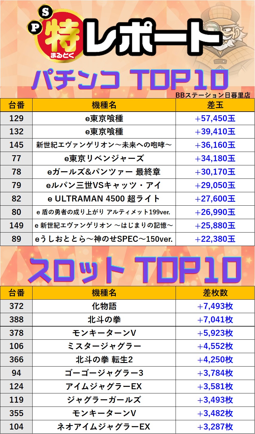 東京BBステーション日暮里店 過去の取材結果はこちら 取材日 2026年2月14日(土) 並びの人数 抽選37名 / 一般6名 内容 マル特レポート スロミューマル特レポートTOP10 Pickup箇所① Pickup箇所② Pickup箇所③ Pickup箇所④ Pickup箇所⑤ Pickup箇所⑥ Pickup箇所⑦ Pickup箇所⑧ Pickup箇所⑨ Pickup箇所⑩ Pickup箇所⑪ その他Pickup箇所 過去の取材結果はこちら