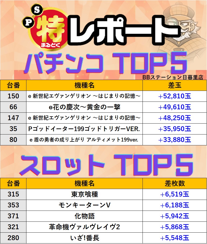 東京BBステーション日暮里店 過去の取材結果はこちら 取材日 2026年2月22日(日) 並びの人数 抽選53名 / 一般20名 内容 マル特レポート スロミューマル特レポートTOP5 Pickup箇所① Pickup箇所② Pickup箇所③ Pickup箇所④ Pickup箇所⑤ Pickup箇所⑥ Pickup箇所⑦ Pickup箇所⑧ 過去の取材結果はこちら