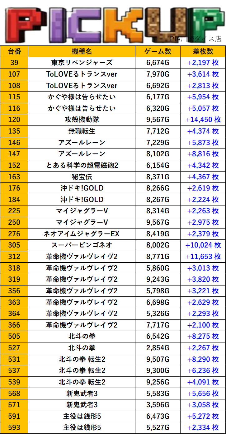 神奈川PIA川崎ダイス店 過去の取材結果はこちら 取材日 2026年2月21日(土) 並びの人数 抽選70名 / 一般155名 内容 スロミュー七福神 Pickup箇所① Pickup箇所② Pickup箇所③ Pickup箇所④ Pickup箇所⑤ Pickup箇所⑥ Pickup箇所⑦ Pickup箇所⑧ Pickup箇所⑨ その他Pickup箇所 過去の取材結果はこちら
